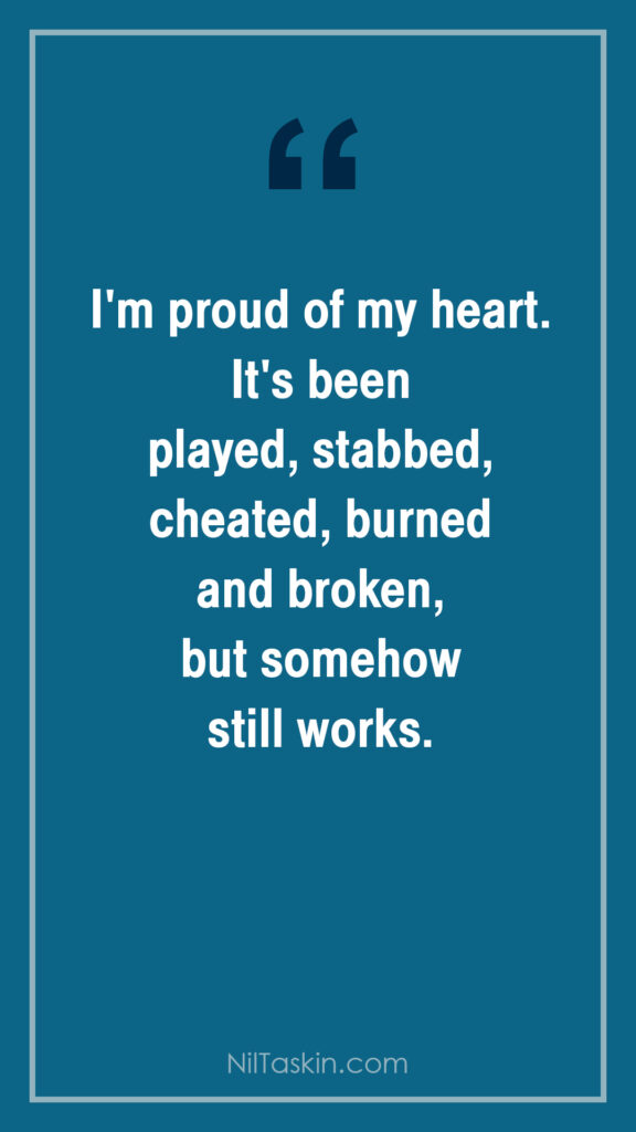 Quote: I’m proud of my heart. It’s been played, stabbed, cheated, burned and broken, but somehow still works.