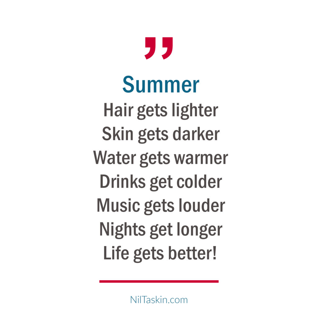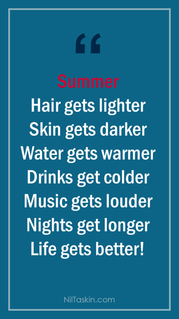 Quote: Summer: Hair gets lighter, skin gets darker, water gets warmer, drinks get colder, music gets louder, nights get longer, life gets better! #MarilynMonroe
